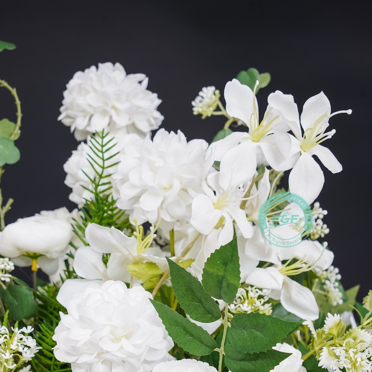 The centerpiece is impressive and substantial,standing at a height of 17.7 inches and spanning a diameter of 17.7 inches. This size makes it a grand focal point that immediately draws the eye,enhancing the overall aesthetic appeal of any setting.Its design,reminiscent of a full and lush flower ball,contributes to its allure.This intricate design not only adds a striking visual element but also infuses a sense of luxury and elegance into your table settings.It’s the perfect choice for those seeking to transform their tablescape into something truly special and memorable.The lifelike green leaves provide a natural accent to the arrangement, making it a beautiful addition to any setting.
