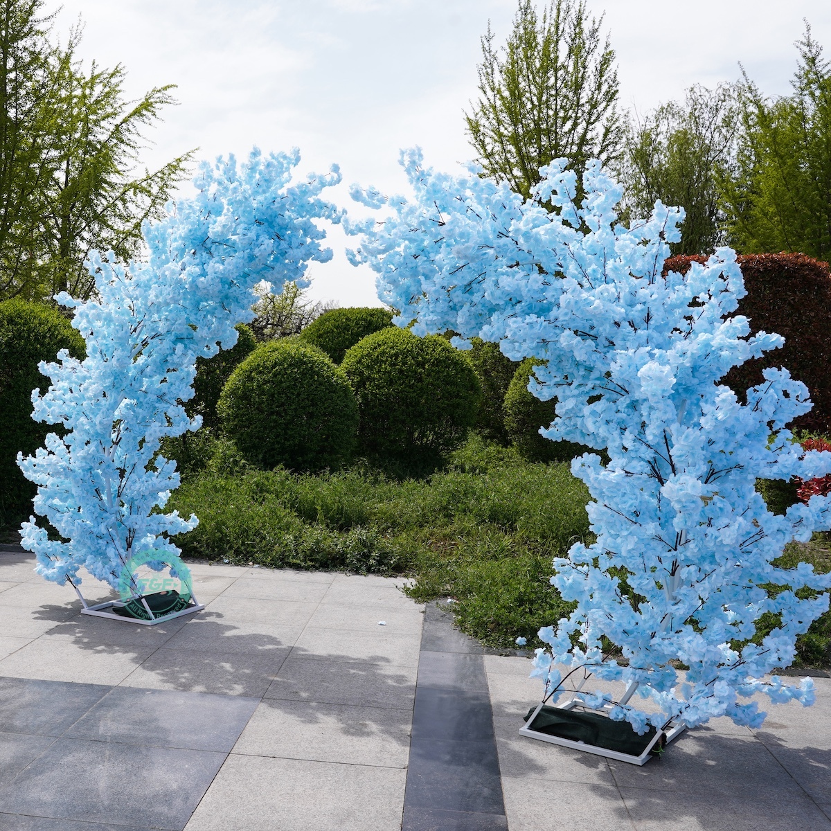 The arch is adorned with premium silk cherry blossom branches, carefully crafted to replicate the delicate texture and natural movement of real blossoms. Each branch features soft blue petals and lifelike detailing, creating a full, layered floral effect that photographs beautifully from every angle.