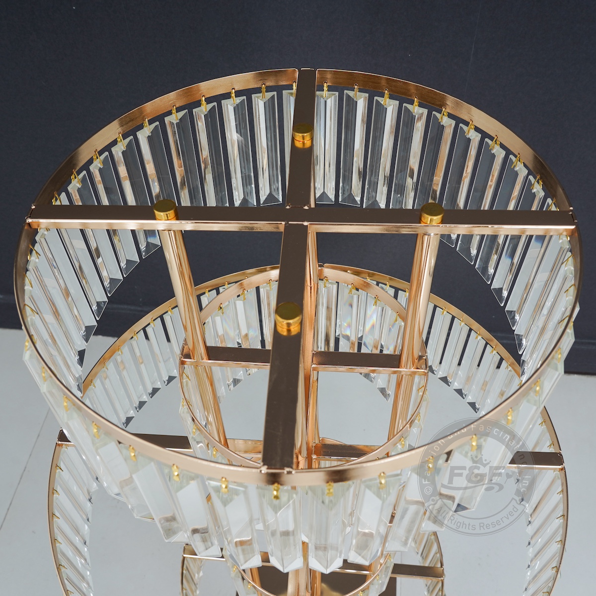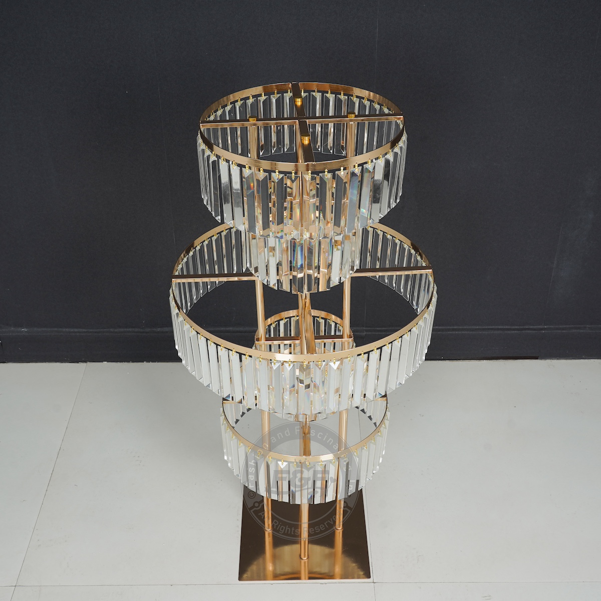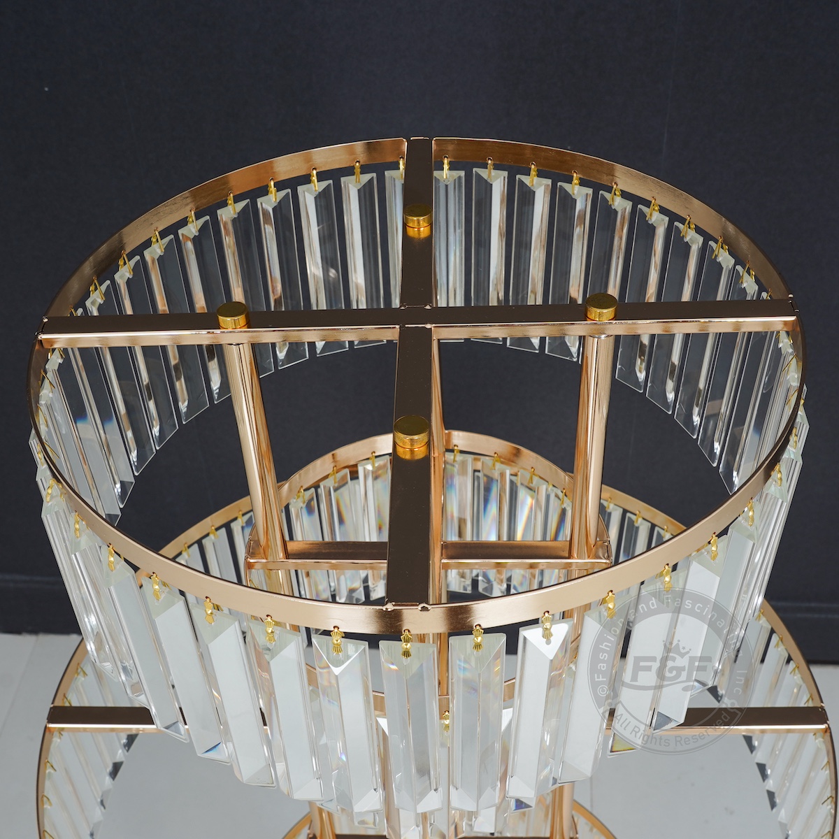 • Package Includes: 2 x 40″ Tall 5-Tier Gold Centerpiece Stands with Crystal Glass Pendants