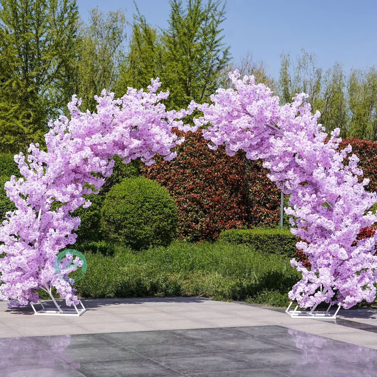 The arch is adorned with premium silk cherry blossom branches, carefully crafted to replicate the delicate texture and natural movement of real blossoms. Each branch features soft purple petals and lifelike detailing, creating a full, layered floral effect that photographs beautifully from every angle.